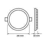 Deze LED downlight heeft een zaagmaat Ø225mm en een buiten maat van Ø240mm.