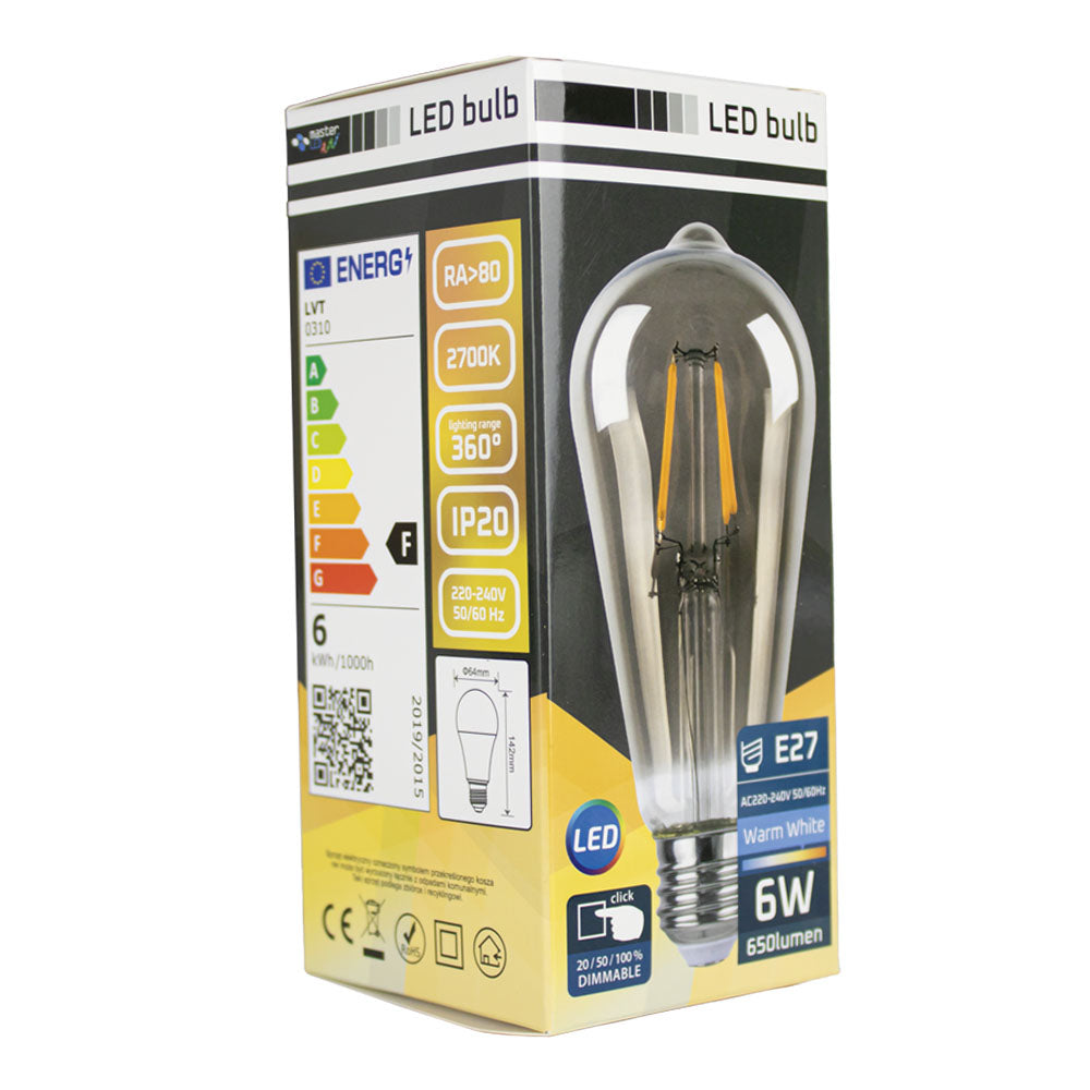 Deze LED Filament lamp 6W heeft een diameter van 64mm en wordt veel gebruikt om sfeer in uw ruimte aan te brengen. Door het moderne Smoked design is de lamp uitermate geschikt voor een open wand- of hangarmatuur. De Led Filament lamp is ideaal voor alle decoratieve armaturen in restaurants, bars en bedrijven, maar natuurlijk ook voor in uw eigen woning. Met zijn E27 fitting kunt u ze één op één vervangen met uw huidige E27 lampen, er zijn geen aanpassingen nodig aan uw huidige armatuur/fitting.