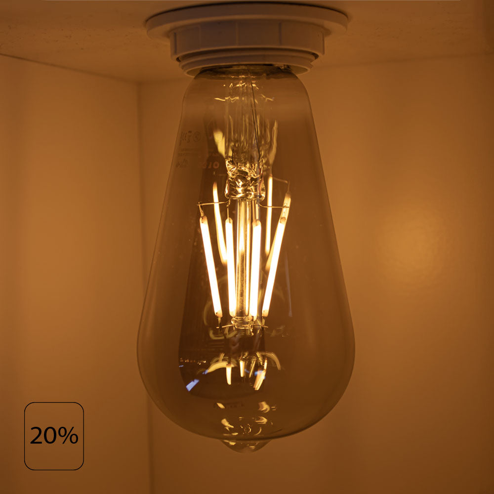 De lamp is dimbaar ZONDER een LED dimmer. Deze lamp kan je eenvoudig in elke vloerlamp / tafellamp of een andere lamp plaatsen waar je geen dimmer hebt. Wanneer je de lamp 1, 2 of 3x inschakelt met een normale schakelaar zal deze van lichtsterkte veranderen. Van 100% --> 50% --> 25% lichtsterkte.