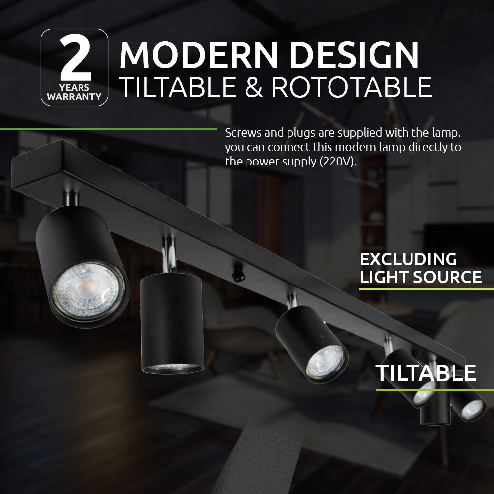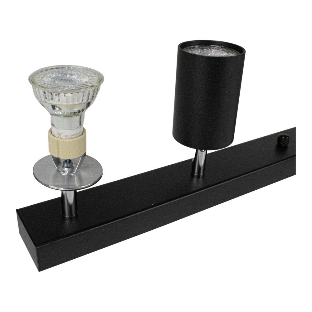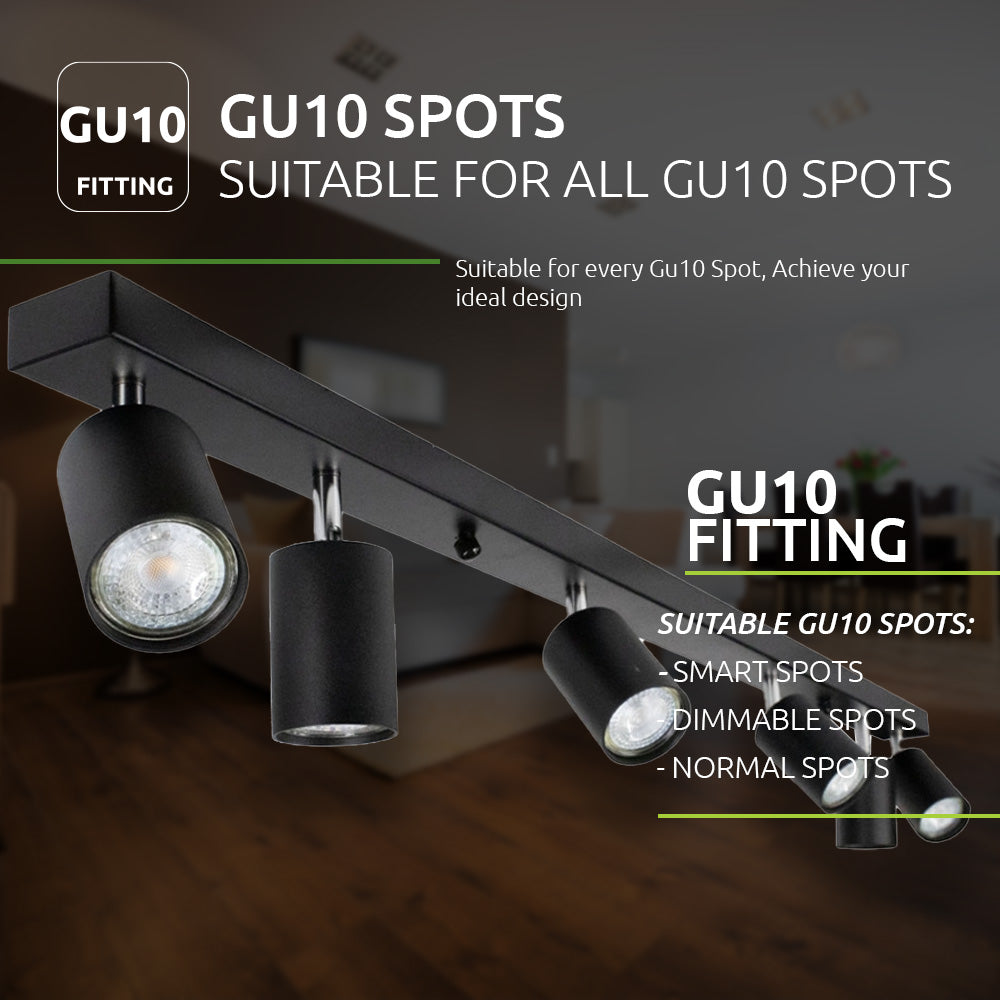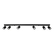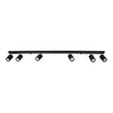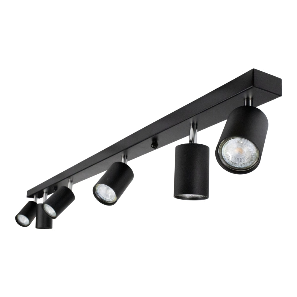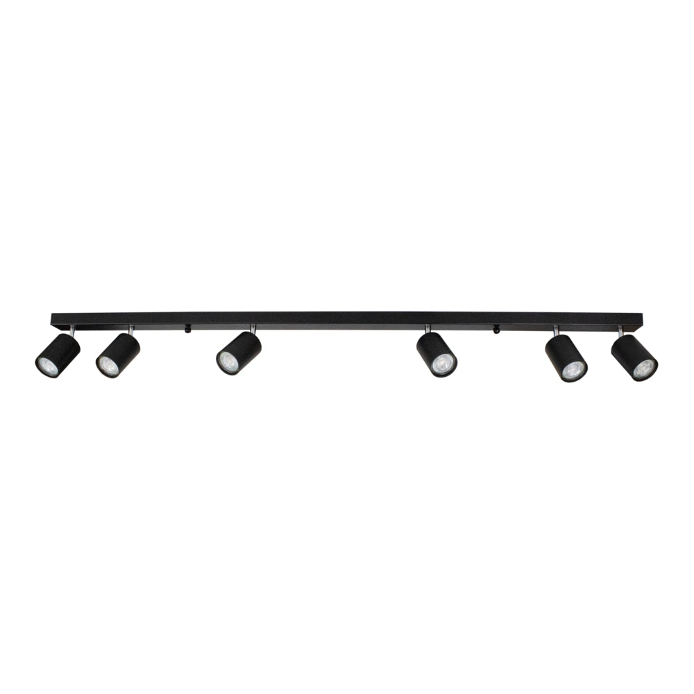 Deze opbouw plafondspot is niet alleen erg functioneel, maar heeft ook een moderne uitstraling! De plafond spot beschikt over 6 keer een GU10 fitting en wanneer u er 6 GU10 spots bij bestelt, is uw plafondlamp helemaal compleet! De behuizing is gemaakt van aluminium en is gespoten in een mat zwarte kleur. Wilt u de plafondspot dimmen? Deze zesvoudige opbouwspot is optioneel dimbaar wanneer u er dimbare GU10 spots bij neemt. In combinatie met een LED dimmer kunt u de plafondspot vervolgens dimmen. Deze zwarte opbouw spot heeft een IP-waarde van IP20 en is daarmee geschikt voor binnen gebruik. De plafondspot heeft een lengte van 120 centimeter en een breedte van 5 centimeter. Verder heeft de plafondlamp een hoogte van 12,5 centimeter. De 6 kantelbare spots hebben elk een diameter van 5,5 centimeter en een hoogte van 10 centimeter. Daarnaast heeft de montageplaat een breedte van 50mm. De plafondspot is 350 graden kantelbaar en draaibaar. De lamp is niet enkel geschikt als plafondlamp, maar kan ook als wandlamp gemonteerd worden. De mogelijkheden zijn eindeloos!