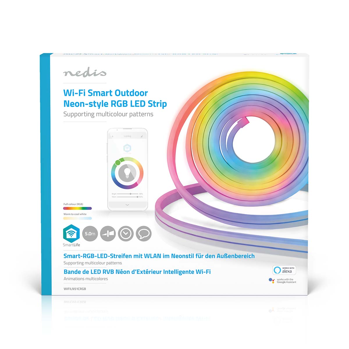 Deze LED-strip in neonstijl kan dankzij zijn volledig waterdichte behuizing en de netvoedingsadapter voor buiten (IP44) zowel binnen als buiten worden gebruikt. Anders dan bij andere LED-strips zijn er geen afzonderlijke LED's zichtbaar. In plaats daarvan toont hij een enkele strip licht in elke door jou gewenste kleur. Sluit hem thuis rechtstreeks aan op je WiFi met de gratis Nedis SmartLife app en regel, waar je ook bent, in de app de kleur, helderheid of de instelling van meerkleurige patronen. Stel schema's of automatiseringen in, of gebruik je stem om deze LED-strip samen met alle andere Nedis SmartLife producten te bedienen (werkt met Google Home of Amazon Alexa). De lengte van 5 meter kan tot de gewenste lengte worden ingekort. Er worden montagebeugels meegeleverd om deze strip stevig te bevestigen.