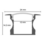 Dit inbouw profiel voor een LED Strip is 24mm breed en 2 meter lang en is gemaakt van aluminium. Verder heeft het profiel een hoogte van 14,2mm. Het opbouw profiel voor LED Strips kunt u op lengte de gewenste lengte zagen. Dit inbouwprofiel is gemaakt om in een muur te bouwen. Hierdoor is het profiel / led strip mooi weggewerkt in de muur. Erg mooi en elegant, tevens te gebruiken in badkamers of buitenshuis. U heeft dan wel een waterdichte LED strip nodig.
